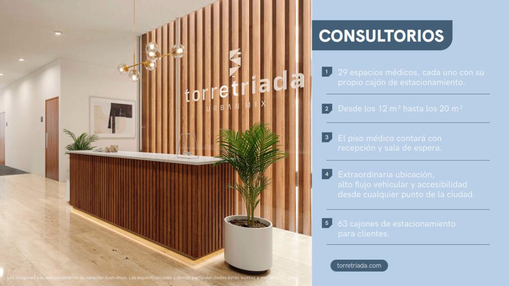 Amplio consultorio médico de altura Triada Care Ideal para consultorio médico o de especialidades de la salud en la torre Triada Con estacionamiento privado, estacionamiento público, recepción y sala de espera.