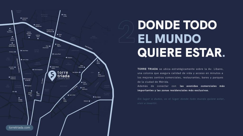 - Está ubicado en la Calle 20 Esquina 1-G en la colonia México, Norte CP 97128 en Mérida, Yucatán, en el nivel 12 del edificio Triada. Zona México Norte, una de las áreas con mayor plusvalía y flujo en Mérida El puerto de Progreso a 30 min, Aeropuerto 20 min, periférico 5 min, centro 15 min, centro comercial The Harbor 5 min.